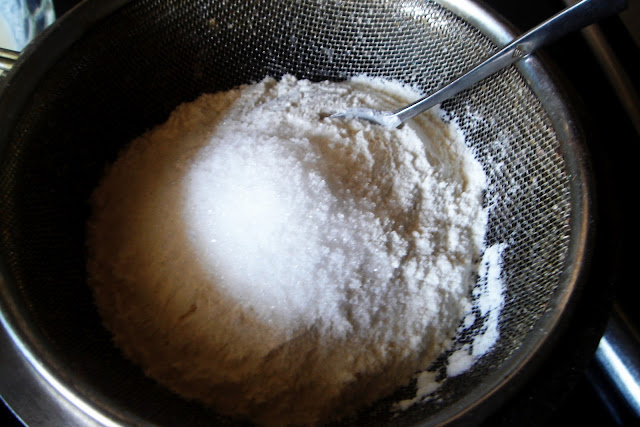 In a big bowl, sift together Flour, Sugar, Salt and Baking Powder. Set Aside.