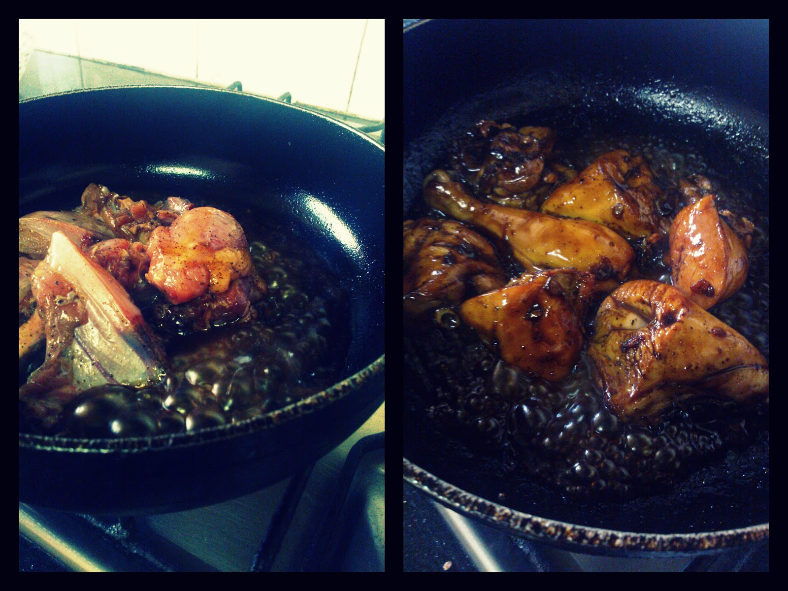 Add in the Soy and Vinegar, give it a good stir and add in the Chicken.